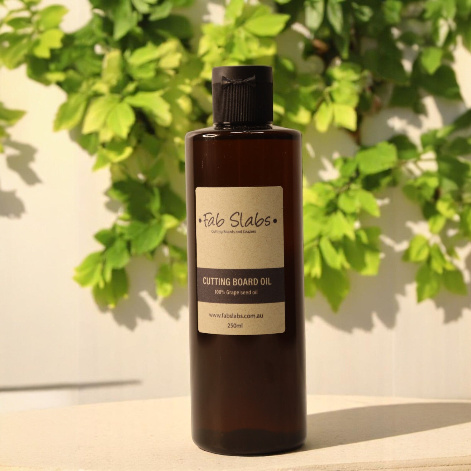 To keep your cutting board looking fresh and well-maintained, we recommend our food-safe Fab Slabs grape seed oil.